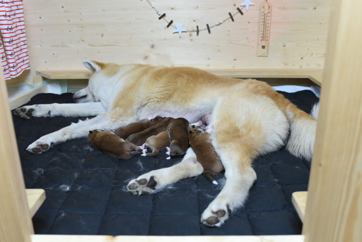 Zuhause angekommen legten wir die Welpen in die Wurfkiste … und beobachteten wie die komplett verwirrte Ryoko das ganze Haus absuchte … offenbar nach ihren Welpen. Panisch lief sie von Stockwerk zu Stockwerk und grub jedes Hundebett um. Sie baute immer noch Nesterln. Schließlich beruhigte sie sich und ging zu den Welpen, die sie säugte und pflegte. Und so ging das die nächsten Tage weiter. Sie war einerseits die fürsorgliche Ryoko, die in der Wurfbox stillte und dabei ganz brav alle Welpen putzte und ihnen das Bauchi massierte, um den Reiz sich zu lösen zu stimulieren. Dann schleckte sie alles auf, was die Welpen von sich gaben. Auch das Kacki wurde aufgegessen, ganz wie es sich gehörte. Sobald sie aber mit ihrer Pflicht fertig war, verließ sie die Wurfbox und suchte das Weite. Sie ging in den Garten und fing an wieder Nesterln zu bauen. Sie versteckte sich unter der Poolstiege, da wo sie nie liegt außer ein paar Tage vor der Geburt. Mit Leckerlies ließ sie sich nicht rauslocken, und als ich zu ihr drunter krakselte, um sie rauszuholen, brummte sie mich an. Ryoko hat mich noch NIE angebrummt! Ich hatte Angst, sie würde die Welpen ablehnen. Ich hatte Angst, sie würde nicht genug Milch produzieren, ich hatte Angst um die Welpen, … Sorgen und Ängste, das sollte wohl diesen Wurf begleiten …