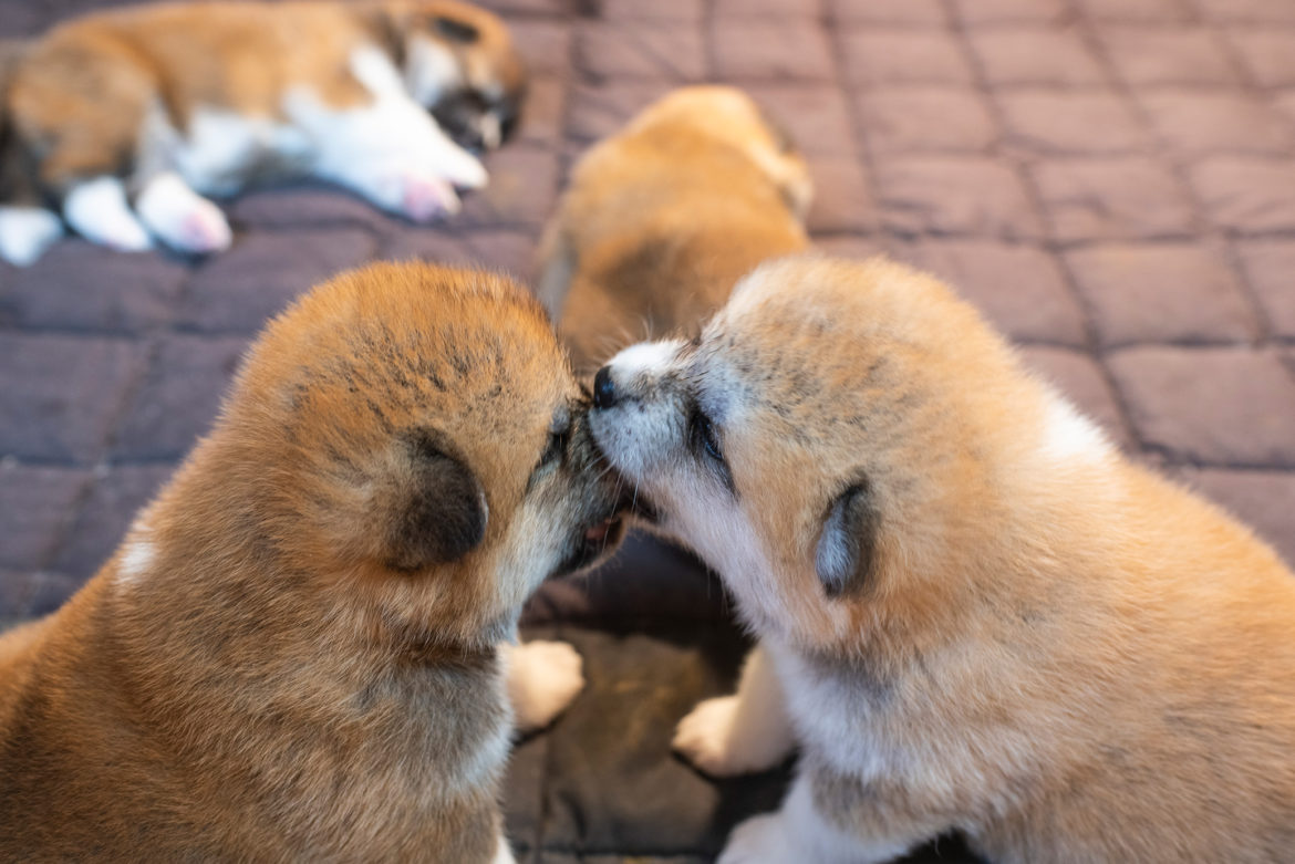 Der größte und süßeste Entwicklungsschritt ist aber die Interaktion miteinander, mit Ryoko und mit uns. So wie anfänglich ihr Leben nur aus trinken und schlafen bestanden hat, scheint zumindest die Nahrungsaufnahme nicht mehr ganz so wichtig zu sein. Sie hören tatsächlich von alleine auf zu trinken. Etwas, das man sich vor drei Tagen noch nicht vorstellen konnte. Da hingen sie auch noch ganz fest an den Zitzen als Ryoko aufstand, um die Wurfbox zu verlassen und plumpsten zu Boden. Jetzt trinken sie, bis sie satt sind und fangen anschließend an, miteinander zu spielen und das schaut schon so richtig echt aus. Sie beißen Schnauze in Schnauze, wie es auch die Großen tun, nur dass das Aufeinanderprallen der Zähne fehlt. Sie versuchen, sich umzuwerfen, ob absichtlich oder weil sie selbst das Gleichgewicht verlieren, sei dahingestellt.